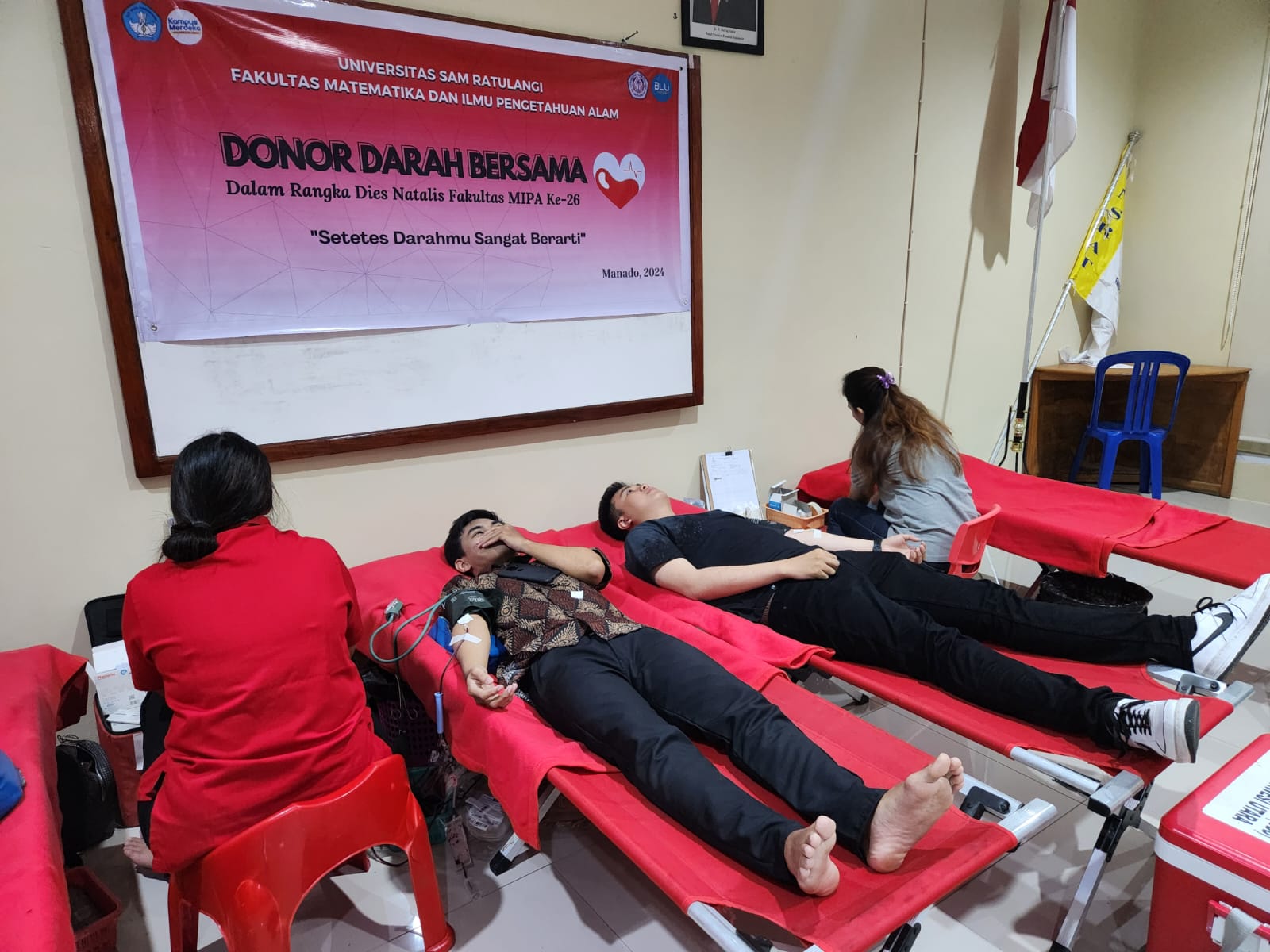 Dalam rangka memperingati Dies Natalis ke-26, Fakultas Matematika dan Ilmu Pengetahuan Alam (FMIPA) Universitas Sam Ratulangi (UNSRAT) menggelar kegiatan Donor Darah Bersama. Acara yang bekerja sama dengan Palang Merah Indonesia (PMI) Sulawesi Utara ini berlangsung pada Jumat, 27 September 2024, dan mendapat sambutan antusias dari seluruh sivitas akademika FMIPA UNSRAT.