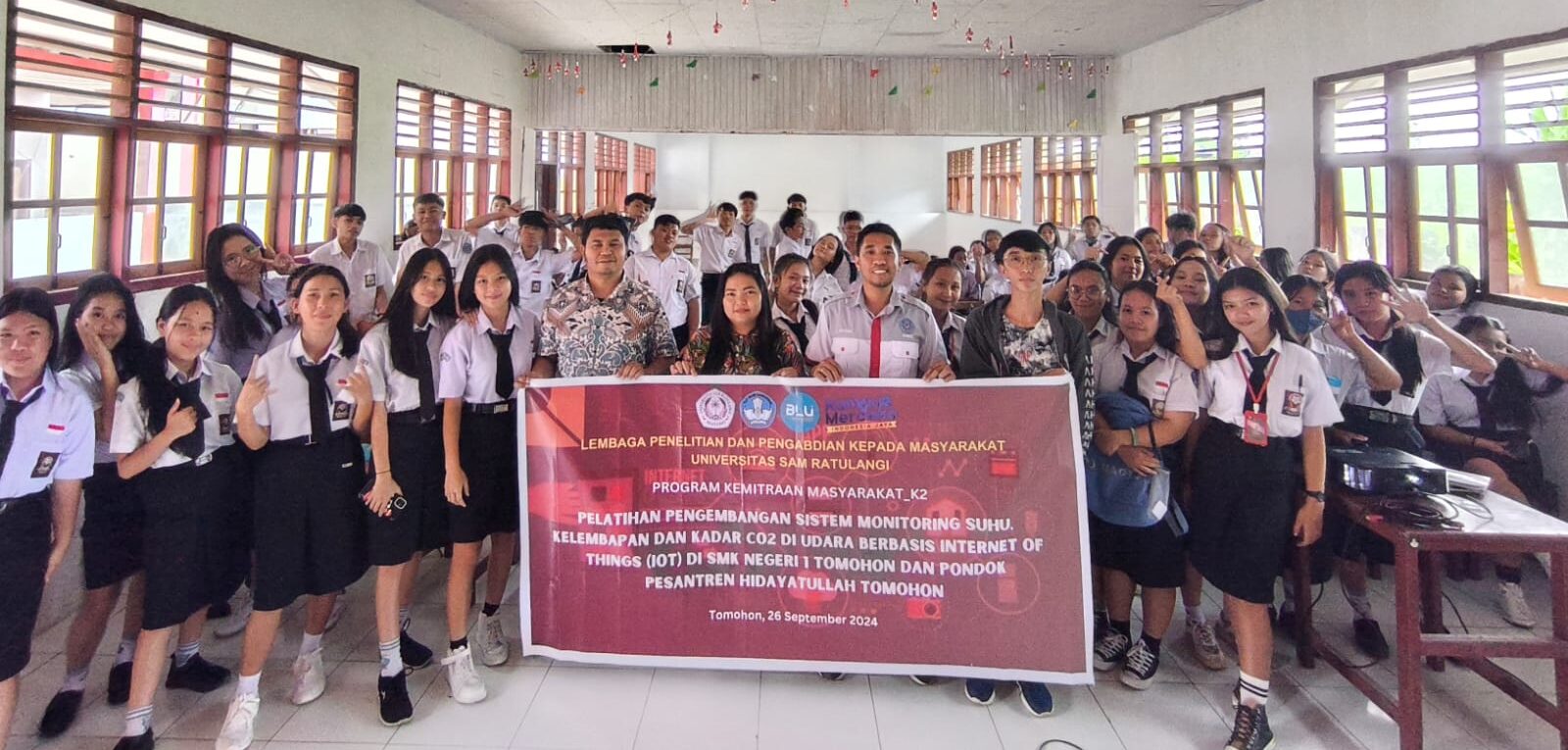 Dalam rangkaian kegiatan ini, Tim Pengabdian dibantu oleh mahasiswa Unsrat menyelenggarakan Sosialisasi dan Pelatihan Pengembangan Sistem Monitoring Suhu, Kelembaban, dan Kadar CO2 berbasis Internet of Things (IoT). Program ini didukung oleh Dra. Ainun Mohammad Saleh, Kepala SMKN 1 Tomohon, serta Adam Syafaat, Ketua Yayasan Pesantren Hidayatullah Tomohon.