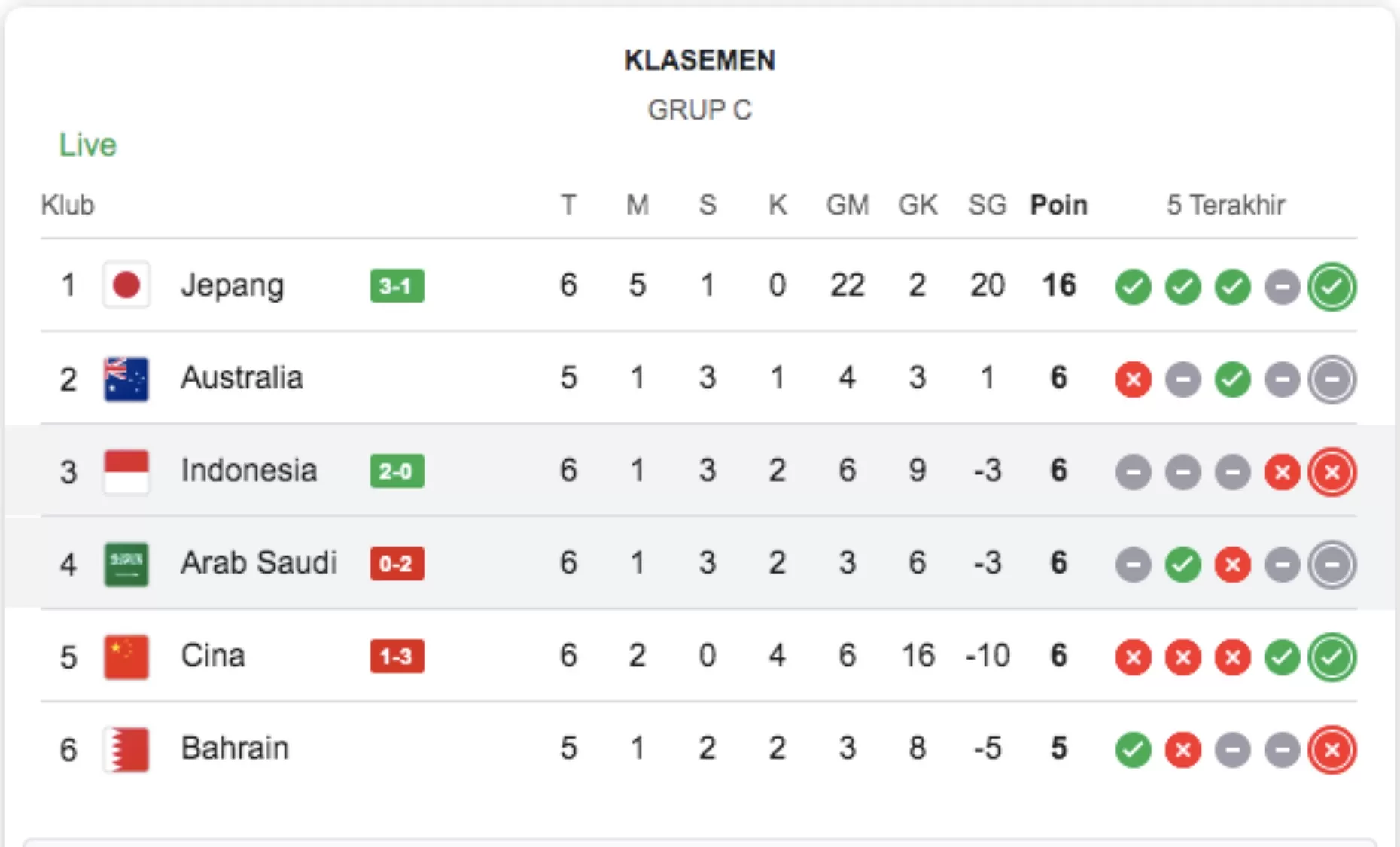 Kemenangan ini membawa Indonesia mengumpulkan enam poin dari enam pertandingan. Sebelumnya, mereka berada di posisi juru kunci dengan tiga poin dari lima laga. Dalam laga lainnya, Jepang memastikan posisi sebagai pemuncak klasemen Grup C dengan kemenangan 3-1 atas China. Pertandingan antara Bahrain dan Australia yang dijadwalkan berlangsung pada Rabu dini hari berpotensi mengubah posisi klasemen.